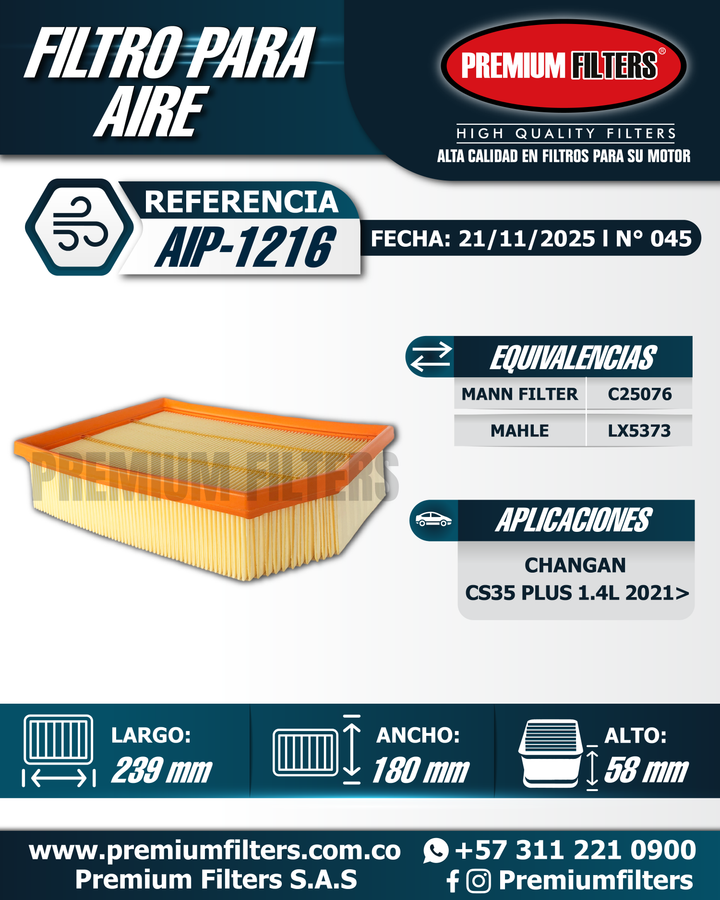 Filtro de Aire / AIP-1216 CHANGAN CS35 PLUS 1.4L 2021>