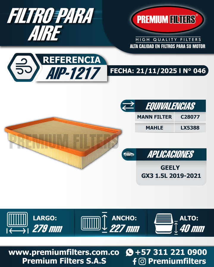 Filtro de Aire / AIP-1217 GEELY GX3 1.5L 2019-2021