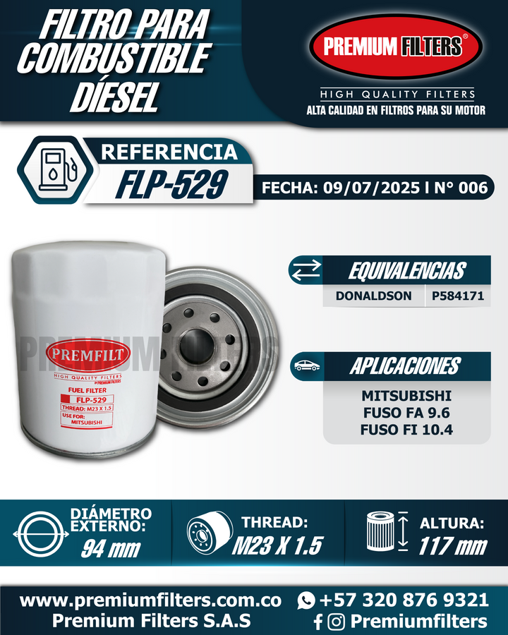 Filtro para combustible FLP-529 FUSO FA 9.6 - FI 10.4 EURO V 2017 - 2021